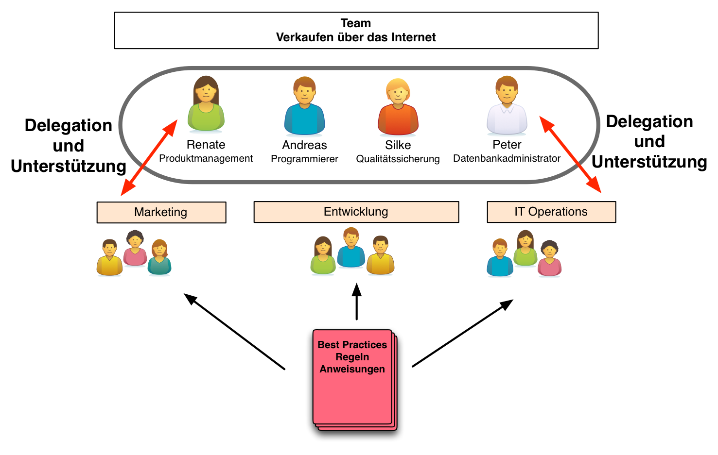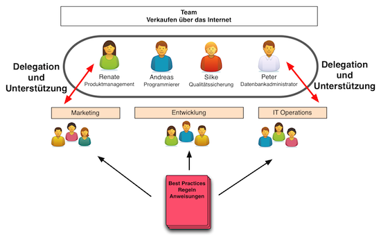 Dazu vergessen wir das Konzept eines Projektes und erschaffen generell das Team "Verkaufen über das Internet". Alles was mit diesem Thema zu tun hat wird zukünftig von diesem Team erledigt. Dieses Team ist keine neue Abteilung, sondern eine Gruppe von Personen, die für ein funktionales Thema zuständig sind.