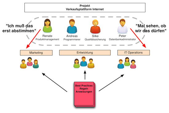 Es ist sehr wahrscheinlich, daß Renate und Peter neben der Arbeit am Projekt und ihrer Mitgliedschaft in der Arbeitsgruppe auch noch andere Aufgaben in ihrer jeweiligen Abteilung zu erfüllen haben. Dazu kommt, daß beide Regeln, Anweisungen und vermutlich auch best practices, die für ihre jeweilige Abteilung gelten, zu beachten haben. Das führt dann dazu, daß z.B. Peter häufig nachfragen muß, ob man diese oder jene Änderung an Datenbanken oder anderen System überhaupt durchführen kann oder darf. Auch wenn er zur Arbeitsgruppe dazugehört und ja dem Projekt Internet-Verkaufsplattform zugeordnet ist, kann er dennoch nicht einfach tun was da jetzt gerade förderlich wäre. Er muß abwägen und Rücksprache mit "seinen" Leuten halten.